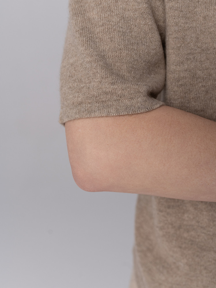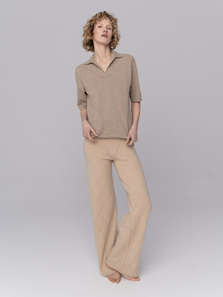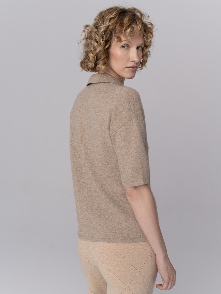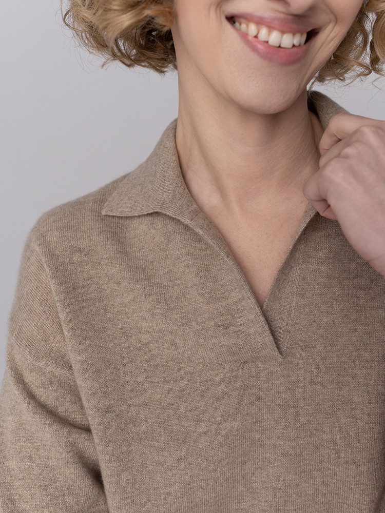 Bluzka wykonana w 100% z najwyższej jakości kaszmiru mongolskiego – szlachetnego, naturalnego włókna cenionego za wyjątkową miękkość i lekkość. Prosty, ponadczasowy krój podkreśla jej elegancki charakter, a dekolt w kształcie litery V w połączeniu z subtelnym kołnierzykiem wprowadza lekkość i dopracowaną estetykę.