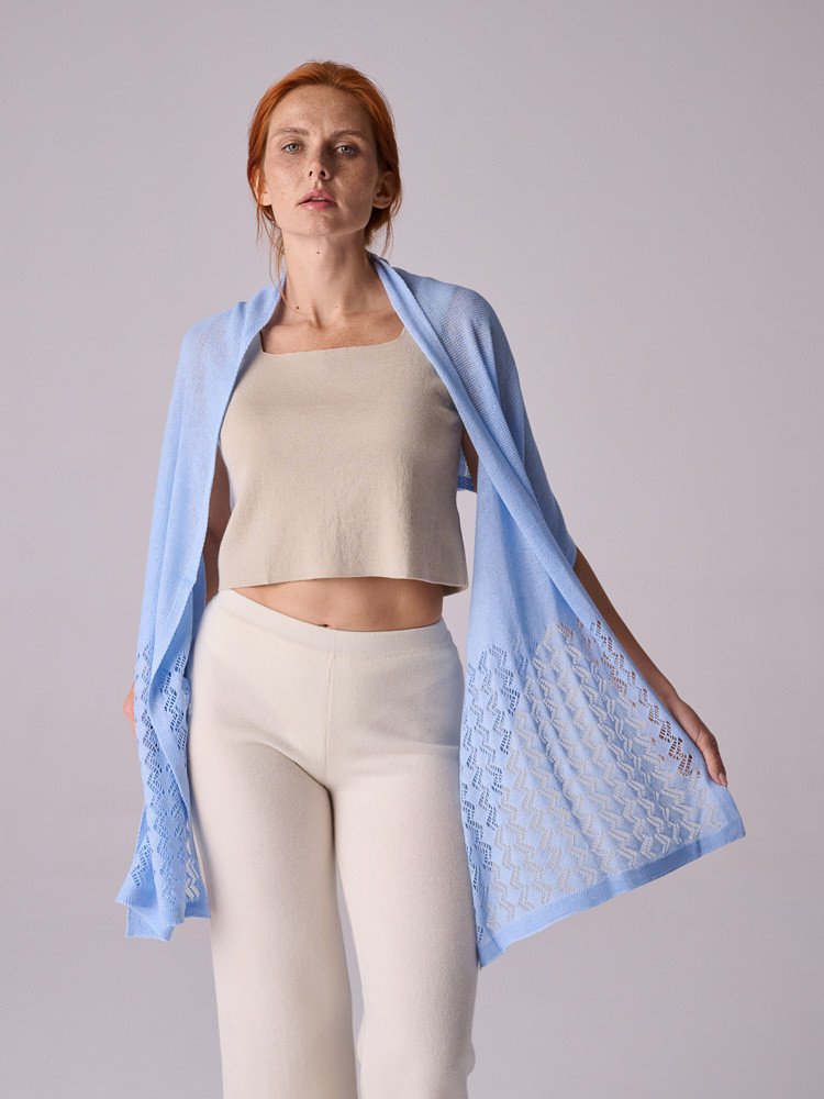 Długi, transparentny szal wykonany z wełny owczej. Dostępny w dwóch pastelowych odcieniach – różowym i niebieskim. Ozdobiony finezyjnym, ażurowym splotem zachwyca delikatnością i lekkością. Miękki dla skóry, zwiewny i kobiecy. Doskonale dopełni zarówno eleganckie, jak i codzienne stylizacje.