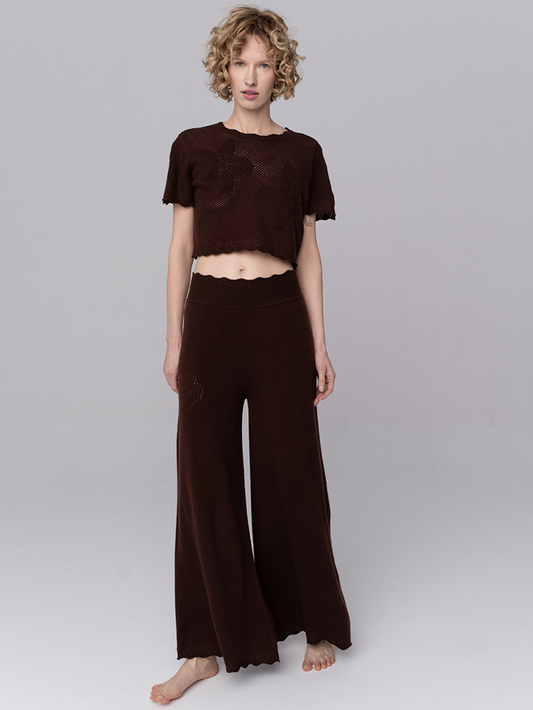 Wykonane w 100% z najwyższej jakości kaszmiru mongolskiego – jednego z najbardziej cenionych włókien naturalnych na świecie. Dzianina jest niezwykle miękka i delikatna w dotyku. Model posiada szeroką, płynnie opadającą nogawkę, która nadaje lekkości i nowoczesnej formy. Ozdobą spodni są ażurowe, kwiatowe motywy umieszczone na obu nogawkach. Delikatny wzór wprowadza subtelną dekorację i podkreśla kobiecy charakter. Naturalny kaszmir posiada właściwości termoregulacyjne oraz antybakteryjne. Włókno jest hipoalergiczne, odpowiednie także dla skóry wrażliwej.