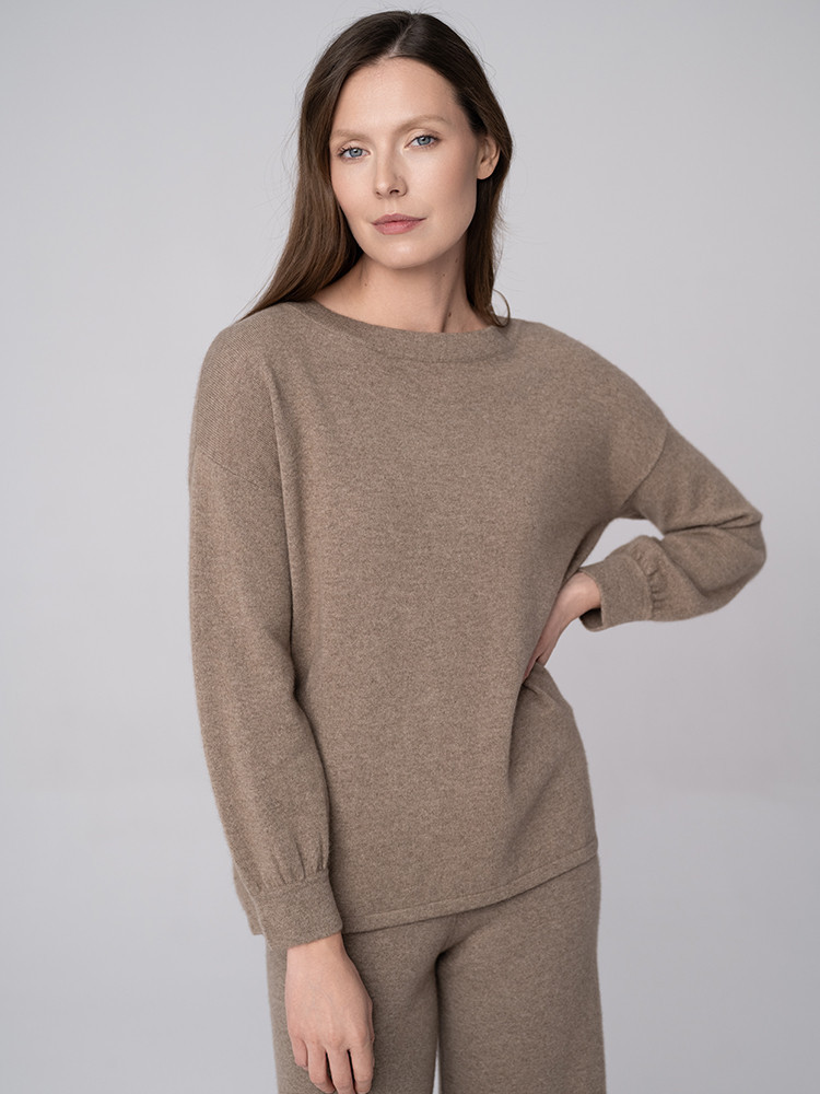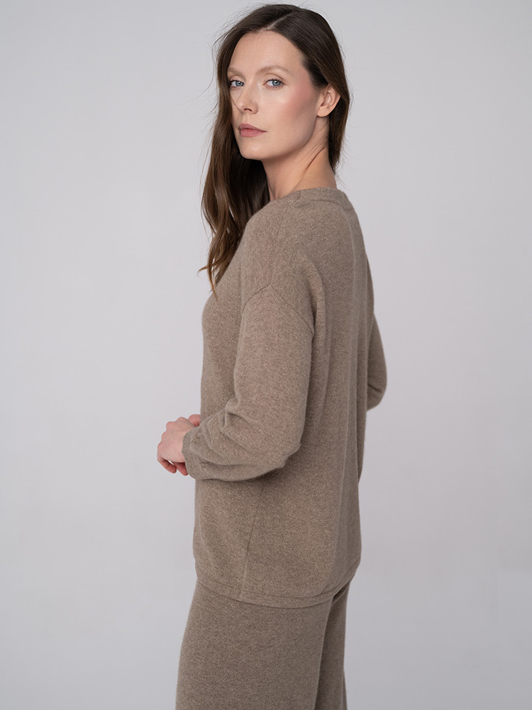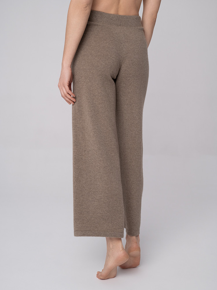 Ekskluzywny komplet wykonany w 100% z najwyższej jakości kaszmiru mongolskiego. Góra o prostej, harmonijnej linii tworzy spójną całość z szerokimi spodniami, które nadają sylwetce swobodnej elegancji. Naturalne włókno kaszmirowe posiada właściwości termoregulacyjne – pomaga utrzymać optymalną temperaturę ciała, chroniąc zarówno przed chłodem, jak i przegrzaniem. Dodatkowo kaszmir jest antybakteryjny i antyalergiczny. Uniwersalny zestaw, który sprawdzi się zarówno na co dzień, do pracy, na spotkania, jak i podczas podróży. Łączy w sobie komfort i nowoczesną estetykę.