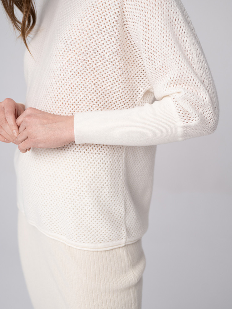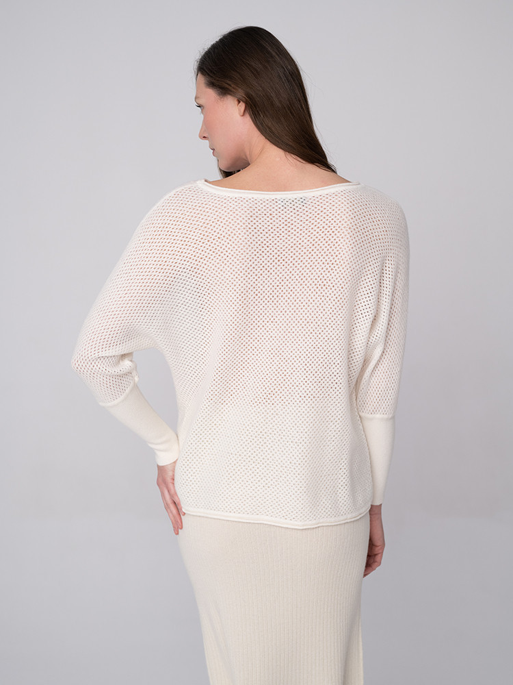 Sweter damski w 100% z najwyższej jakości mongolskiego kaszmiru, cieszącego się opinią najcenniejszego włókna na świecie. Dzięki wysokim parametrom termoregulacyjnym chroni przed chłodem ale również przed wysoką temperaturą, równoważąc ciepło i utrzymując stałą temperaturę ciała. Sweter cechuje się wysoką trwałością, nie kumuluje zapachów ani wilgoci. Sweter jest niezwykle lekki, co sprawia, że jest wygodny do noszenia przez cały dzień. Dzięki uniwersalnemu rozmiarowi idealnie dopasowuje się do różnych sylwetek. Posiada subtelną, ażurową fakturę, która dodaje mu elegancji i lekkości.