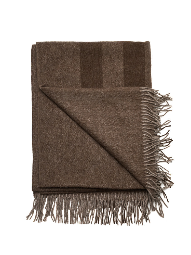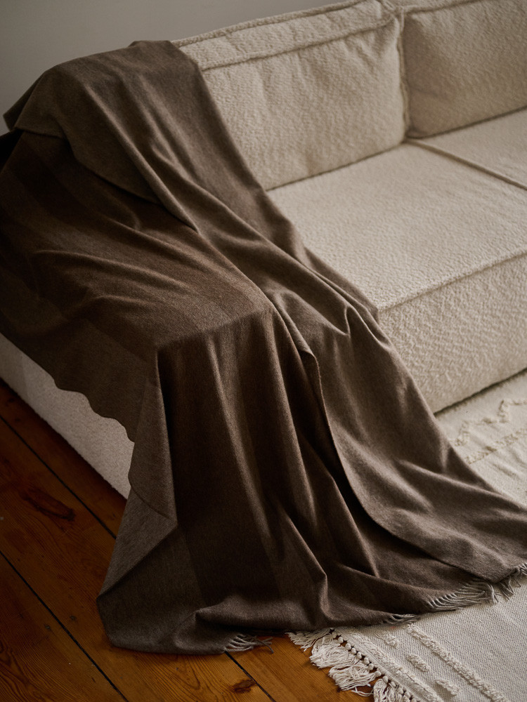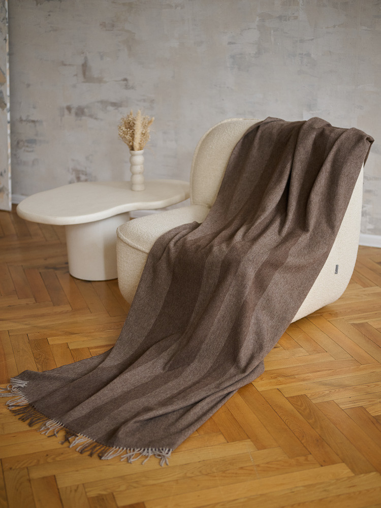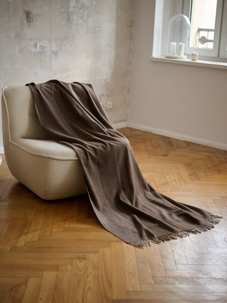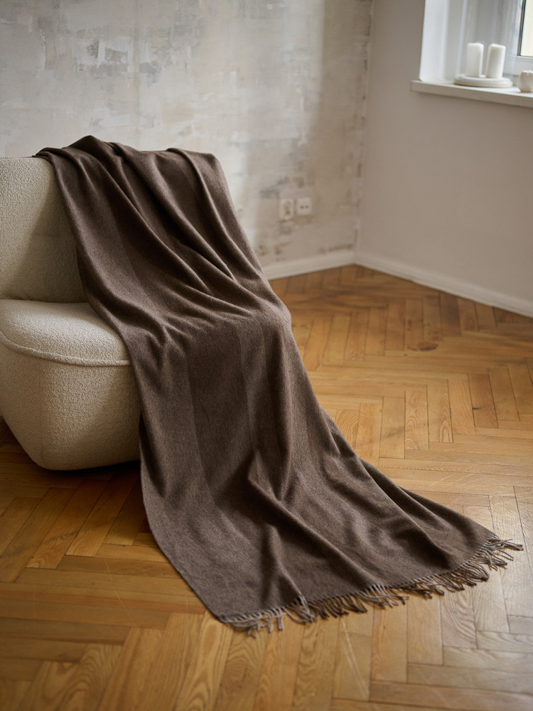 Wełniany koc w brązowym odcieniu wykonany w 100% z naturalnej wełny owczej. Zachwyca eleganckim, minimalistycznym wykończeniem i stonowaną kolorystyką. Przyjemnie otula i umila relaks w domowym zaciszu.