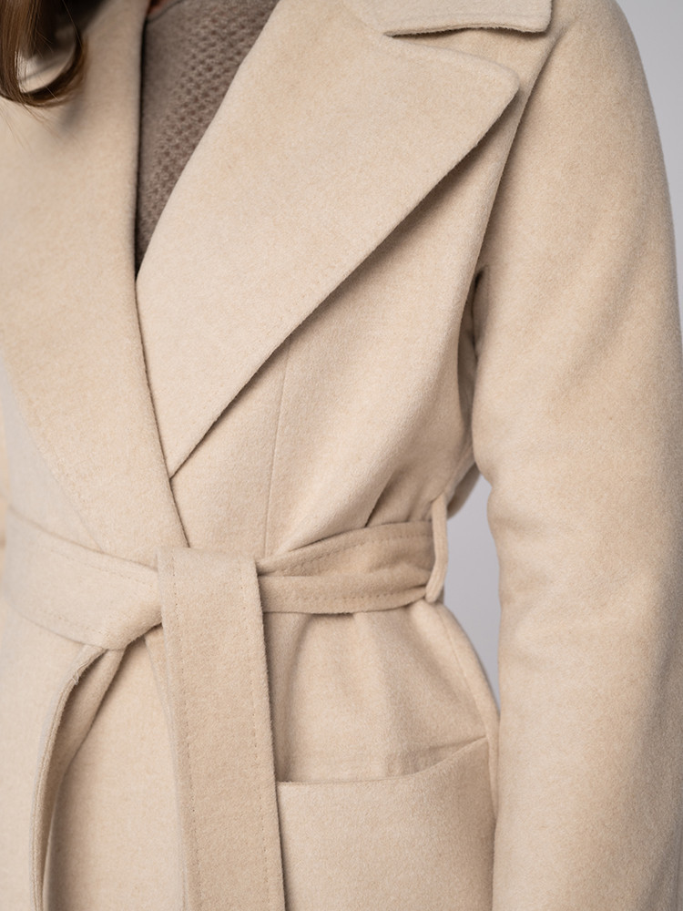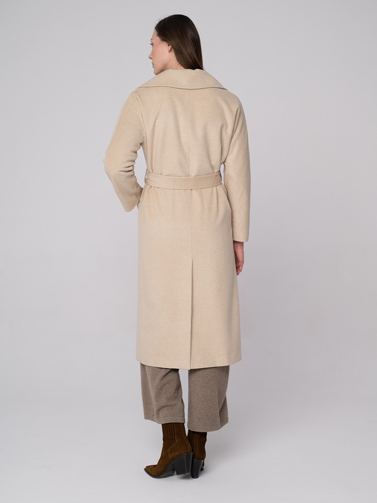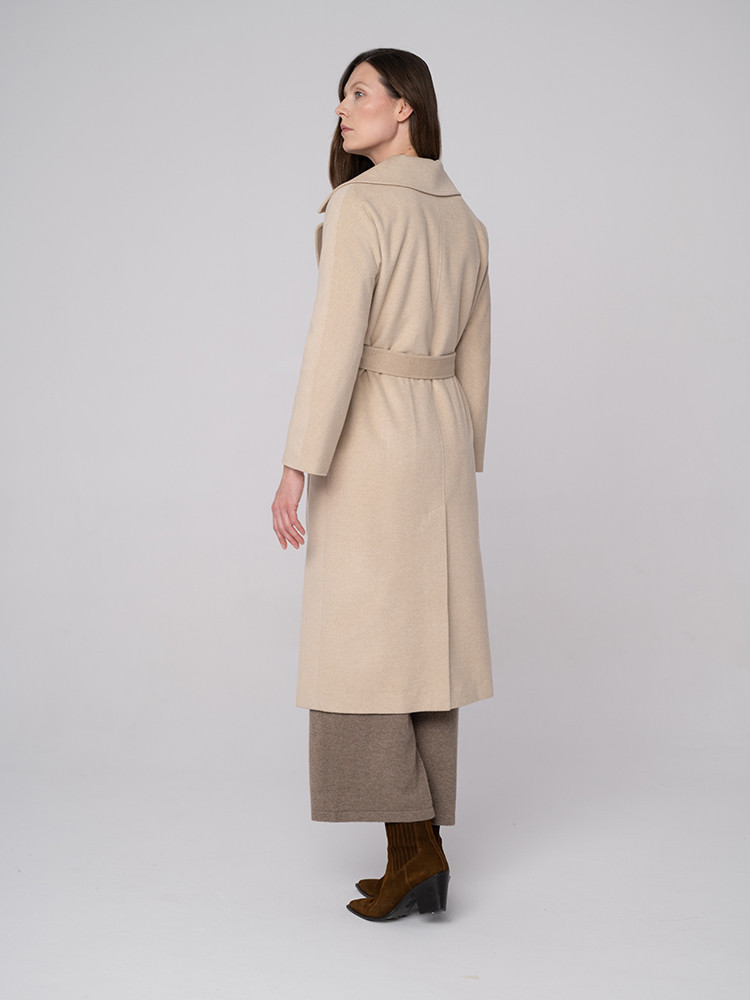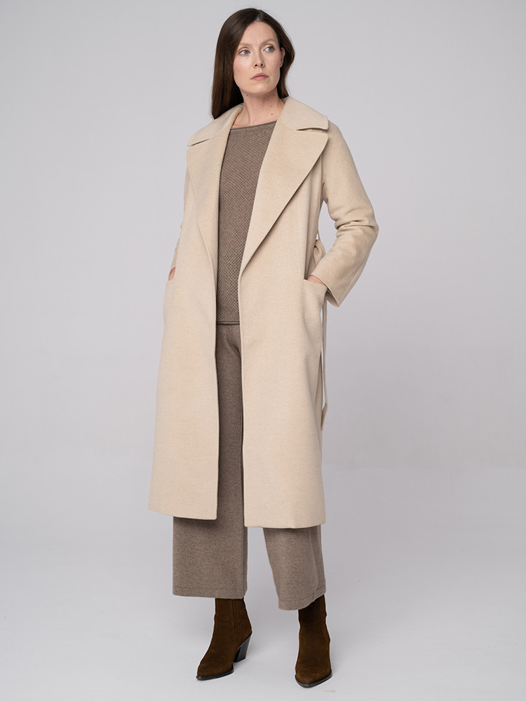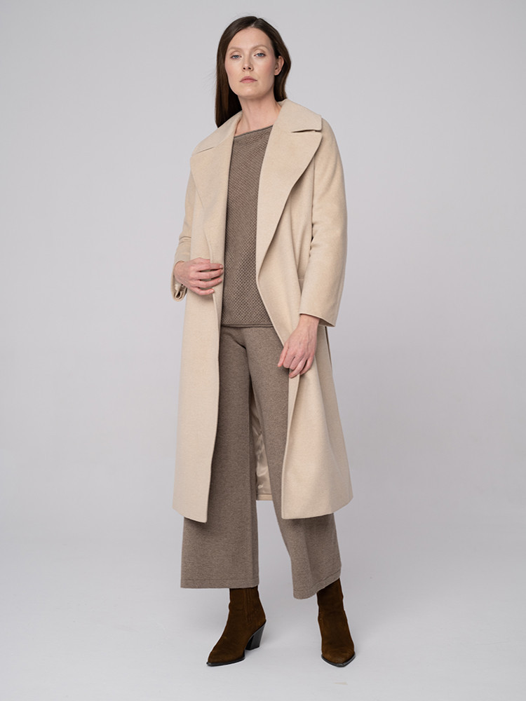Elegancki, długi płaszcz w naturalnym kremowym odcieniu. Wykonany z najwyższej jakości kaszmiru. Zapewnia komfort i styl w każdej sytuacji.