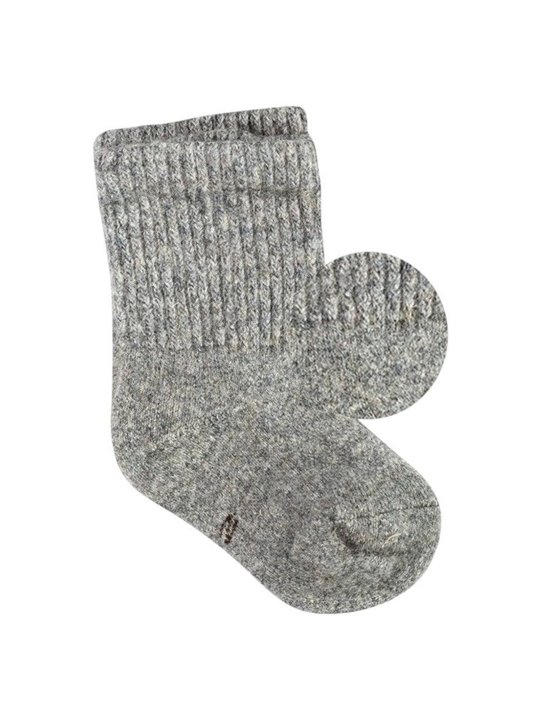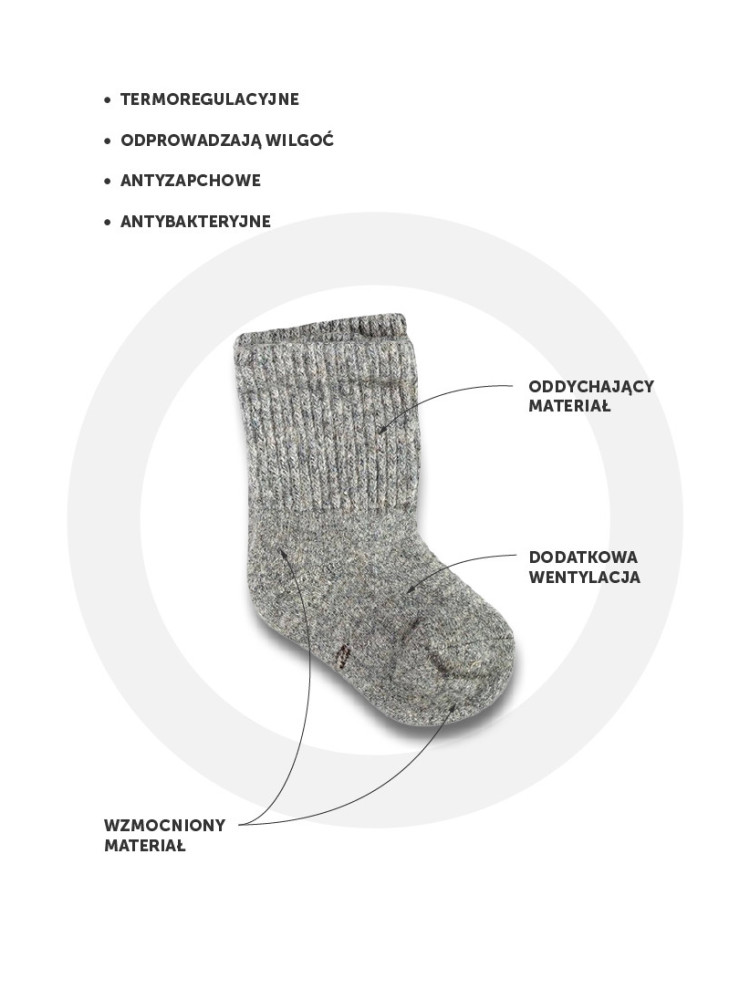 Ciepłe, miękkie, termoregulacyjne skarpetki, niewywołujące alergii, niekumulujące zapachów ani wilgoci. Wełniane skarpety zachowują właściwości termiczne nawet kiedy są przemoczone. Wykonane w 70% z wełny owczej oraz 30% z wiskozy (w celu zwiększenia wytrzymałości). Skarpetki idealne do żłobka, przedszkola i szkoły, jak i na zimowe spacery. W stonowanym, szarym kolorze z ciemniejszymi łatkami na piętach i palcach. Szeroki, bezuciskowy ściągacz, zabezpiecza przed zsuwaniem nie powodując dyskomfortu.