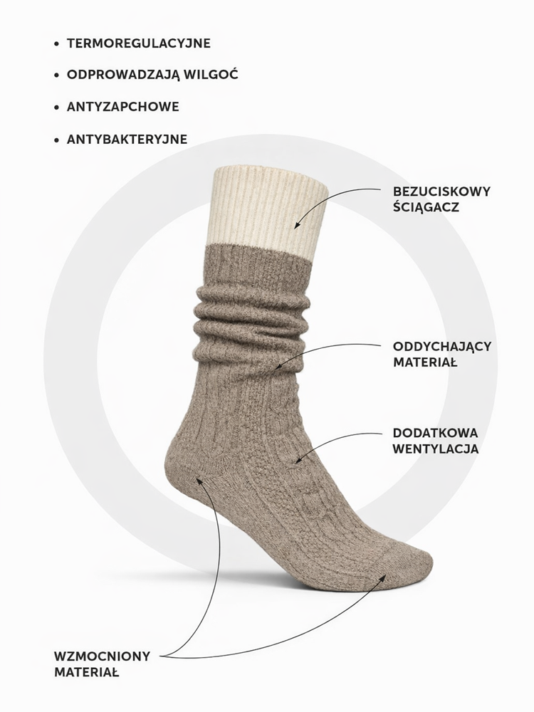 Ciepłe, miękkie, termoregulacyjne podkolanówki, niepodrażniające skóry, niewywołujące alergii, niewchłaniające zapachów. Wełniane podkolanówki zachowują właściwości termiczne nawet kiedy są przemoczone. Elastyczny ściągacz stabilnie utrzymuje kolanówki na nodze. Uniwersalny krój dobrze dopasowuje się do stóp w rozmiarach 36-38.