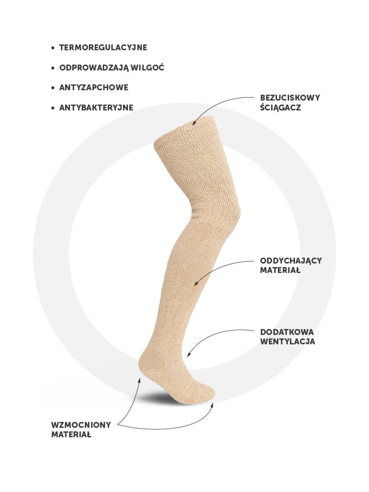 Ciepłe, miękkie, termoregulacyjne zakolanówki, wykonane w 70% z wełny owiec mongolskich i 30% wiskozy. Bezuciskowy ściągacz zapewnia wygodę. Długość zakolanówek sięga uda i gwarantuje dodatkową ochronę przed chłodem. Bardzo dobrze dopasowują się do nóg. Wełniane zakolanówki nie podrażniają skóry, nie wywołują alergii, nie wchłaniają zapachów. Zachowują właściwości termiczne nawet kiedy są przemoczone.