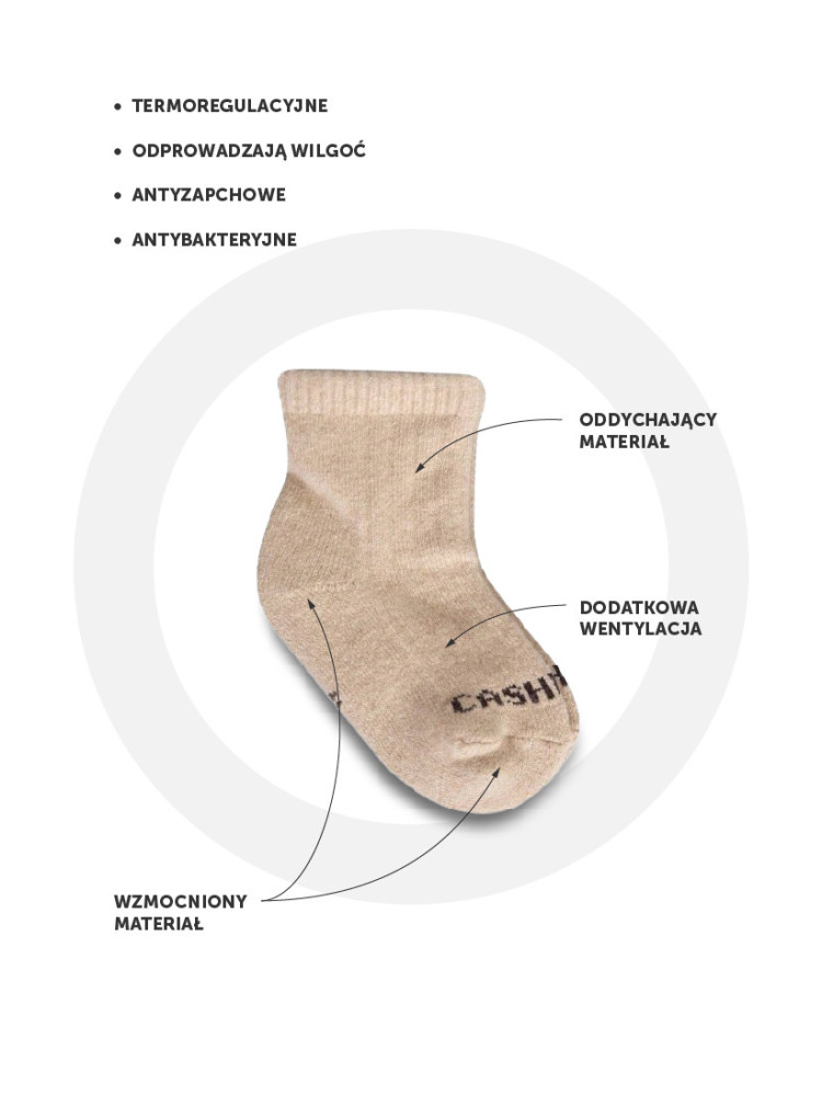 Wygodne, miękkie, ciepłe i przyjemne w dotyku. Kaszmirowe skarpety posiadają właściwości termoregulacyjne, nie kumulują wilgoci, są odporne na zabrudzenia oraz delikatne dla skóry. Mięciutkie skarpetki w naturalnym, beżowym kolorze są odpowiednie dla dziewczynek i chłopców. Zadbają o dziecięce stopy w żłobku, przedszkolu i szkole. Zapewnią optymalną ciepłotę na spacerze i na wycieczce, podczas zabawy na podwórku i w domu.